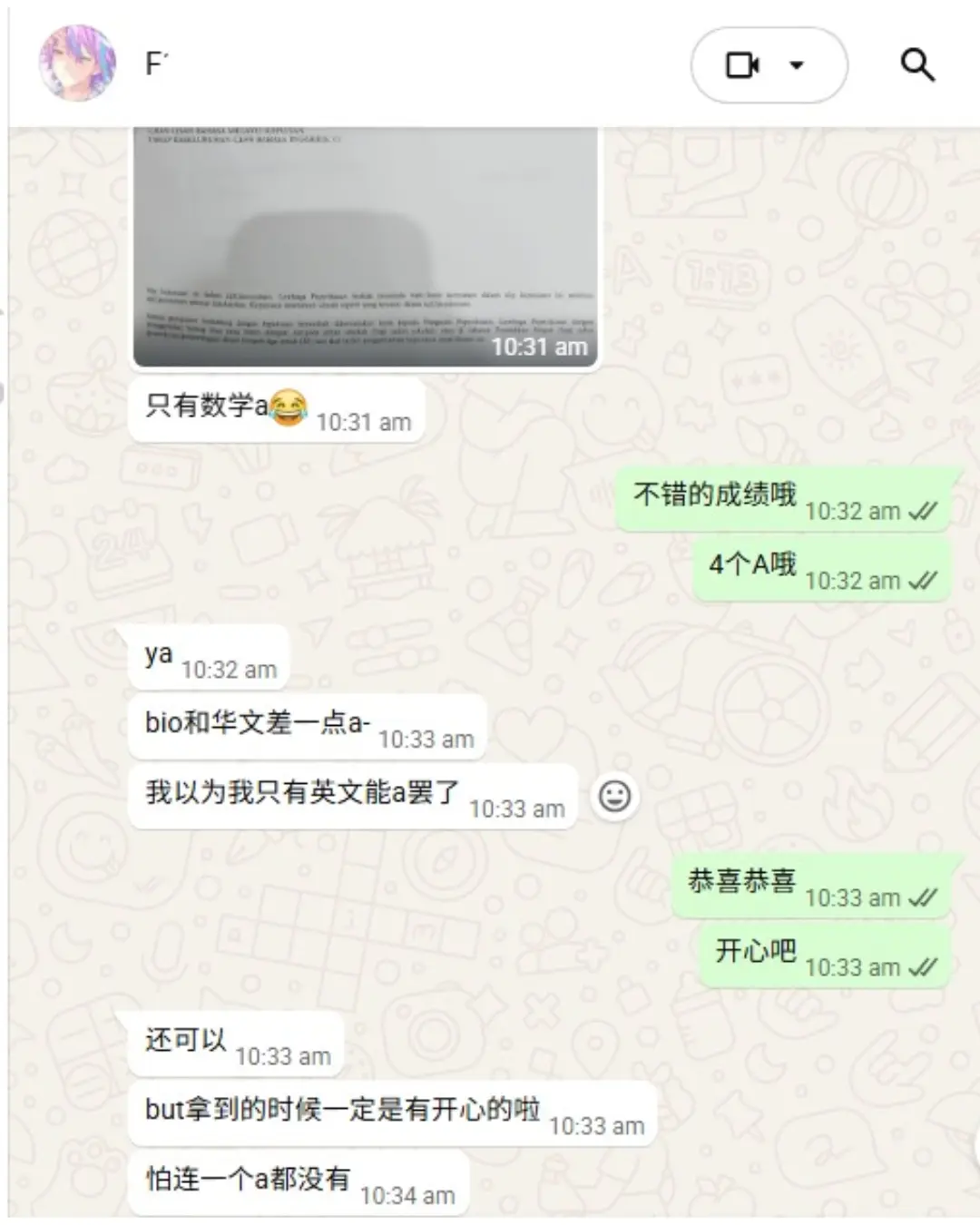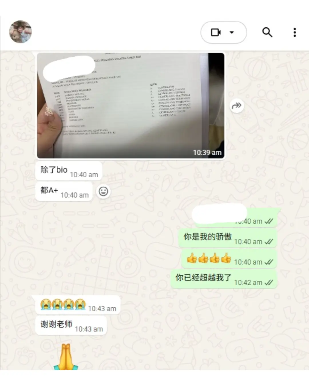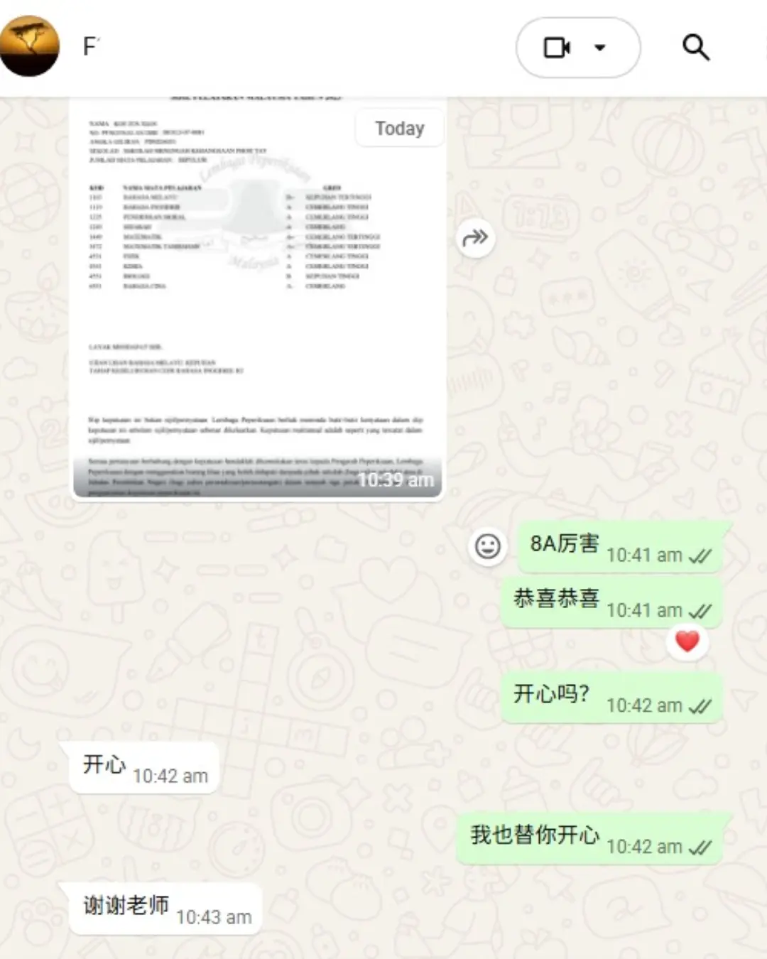 学生林同学(宝宝)在考试中表现卓越,一举拿下华文1、马来西亚文A1、英文A1、数学A1、高级数学A1的优异成绩!尤其是难度较高的高级数学同样取得A1,连学生自己都惊喜不已。