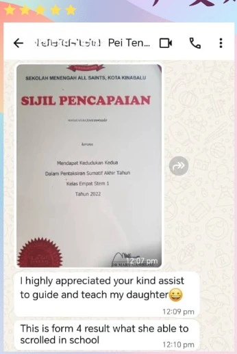 “感谢老师耐心指导與思维导图式的 revision 策略。我女儿在 Form 4 校内考试短短一学期内分数显著提高,尤其在 calculation、diagram 题與 answering 技巧上更有把握,家长非常放心。”